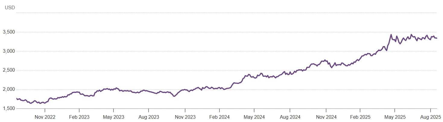 - 2025년 8월 현재: 약 3,330 USD/oz (사상 최고 수준 근처)